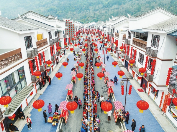 2月4日,吉首市大兴寨水库矮寨移民安置区,移民群众欢聚长桌宴。当天,该安置区开展迎新春活动,民俗展演、长桌宴、年味集市等精彩纷呈,移民群众在崭新家园里,热热闹闹喜迎新春。