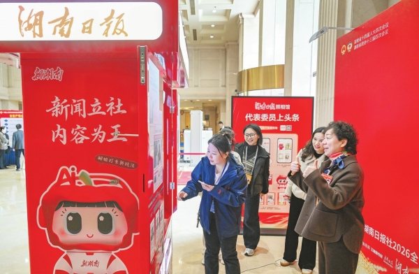 2月1日,出席省两会的代表委员在湖南日报拍报机前争相打卡。 |