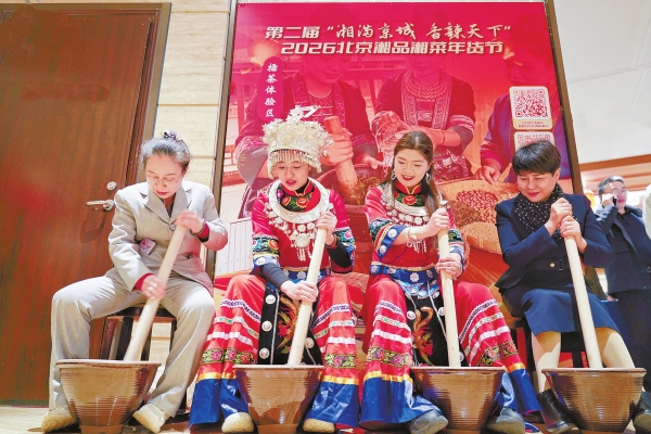 2月8日,消费者在体验制作擂茶。当天,第二届“湘满京城 香辣天下”2026北京湘品湘菜年货节开幕。