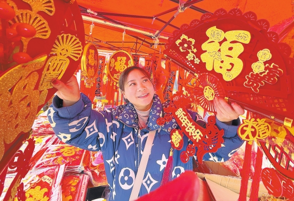 2月8日,通道侗族自治县城东年货集市,市民在选购新春饰品。