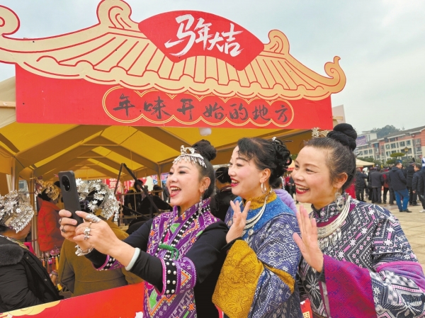 2月9日,通道侗族自治县萨岁文化广场,当地群众通过视频连线,与远方亲友分享家乡年味。
