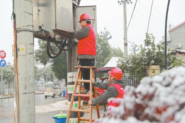 2月9日,共产党员服务队队员在检查陈市1号台区配变设备。当天,石门县迎来降雪天气,国网石门县供电公司宝峰供电所“电骡子”共产党员服务队冒雪巡视10千伏供电线路,全力保障电网安全稳定运行。