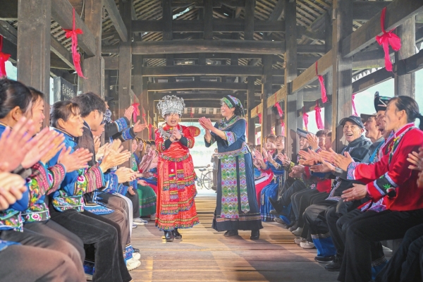 风雨桥上,山歌响起之前,同学们首先布置了一个“声场”。