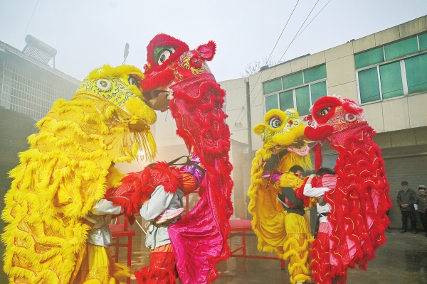 澧县盐井镇洪杨村,村民在观看舞狮表演。