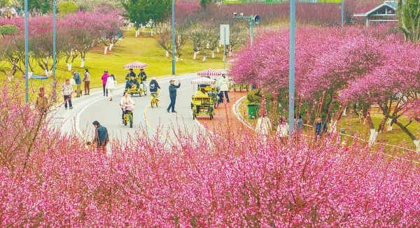 2月21日,湖南松雅湖国家湿地公园,数百株红梅迎春绽放,暗香浮动。众多市民游客前来赏景漫步,在明媚春光中感受盎然生机。湖南日报全媒体记者 李健 摄