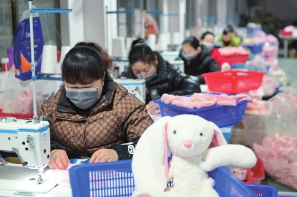 3月1日,双峰县扶光纺织厂,工人在加工出口海外的毛绒玩具。新春伊始,该县企业开足马力进入“满产模式”,全力冲刺首季“开门红”。