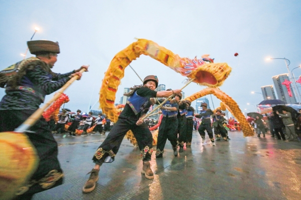 3月2日,龙山县湘鄂情大桥上,民间艺人在进行龙灯表演。当天,该县群众与湖北省来凤县居民欢聚一堂,开展民俗表演,共迎元宵佳节。