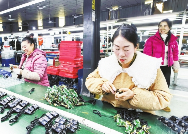 3月3日,嘉禾县石桥镇石市村,村民在村企加工订单产品。