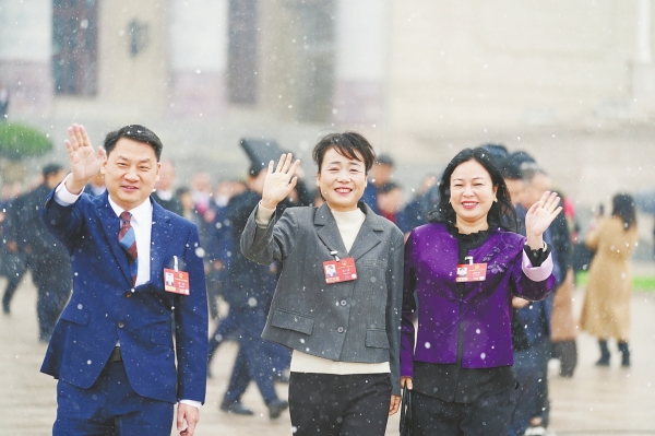 3月4日上午,瑞雪飞扬。十四届全国人大四次会议预备会议结束后,湖南代表团代表走出会场。他们对本次盛会满怀期待。