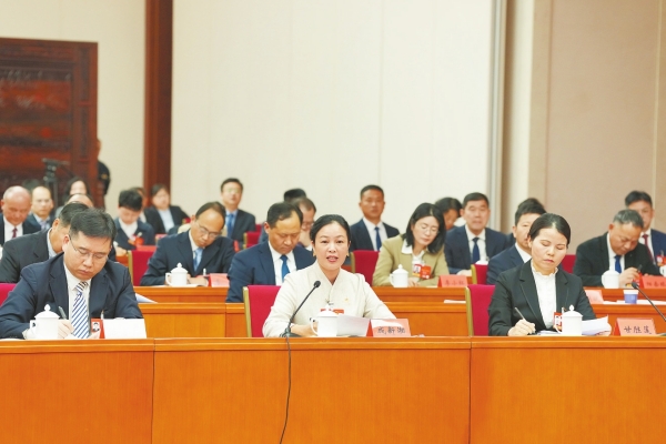 3月5日下午,出席十四届全国人大四次会议湖南代表团第二次全体会议的代表审议政府工作报告。图为成新湘代表在发言。