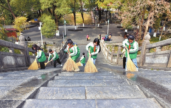 3月5日,吉首市峒河街道向阳社区,光明小学学生在清扫垃圾。当天是学雷锋纪念日,湘西州各地开展形式多样的活动,传承雷锋精神,弘扬时代新风。