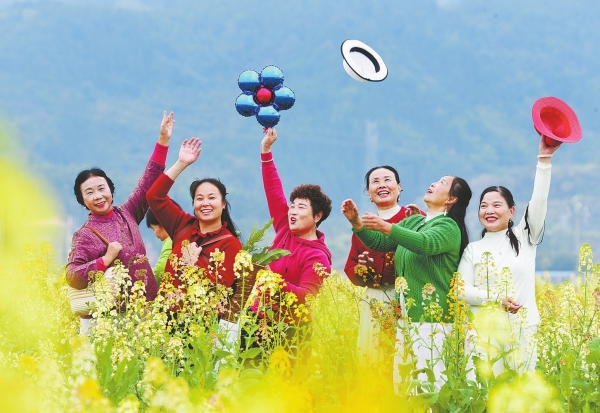 3月5日,蓝山县塔峰镇竹市村,游客在七彩油菜花田踏春赏花。黄春涛 摄(湖南图片库)