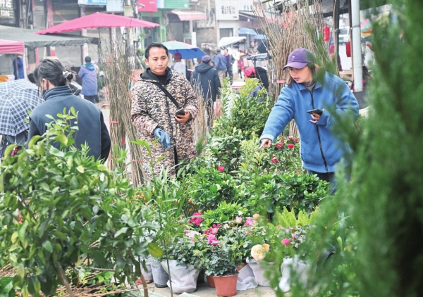 3月7日,花垣县花垣镇苗木市场迎来交易热潮,众多村民精心挑选各类苗木,为美化家园添新绿。