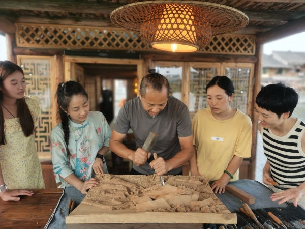 在木雕馆,一幅20米长的铅笔画长卷《湘行散记》徐徐展开。沅江风景、市井民俗跃然纸上。“看,这个撑船的就是我!”安乡潘氏艺术木雕市级非遗传承人潘能辉笑着指向画中头戴斗笠的船夫。为复原沈从文笔下的风貌,2020年起,他11次沿沅江逆行,沿途收集人文风貌、民间工艺、传统风俗、木质建筑等素材;拜访渔民、艄公、画家、民俗专家……花费4年时间,他终于完成绘画手稿。“下一步,我要把它们一刀一刀刻进木头里。”