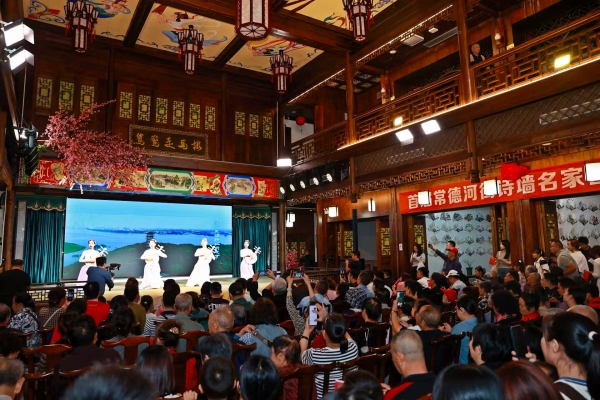 这些画中的建筑,本身已成“舞台”。鸳鸯走马楼以戏楼为主体,是一家涵盖非遗戏曲、民俗曲艺、技艺传习等主题的展演场馆。鸳鸯走马楼外,一块演出告示牌上,节目单排得满满当当:荆河戏、常德丝弦、澧水船工号子、常德高腔……一年300多场惠民演出,场场热闹。