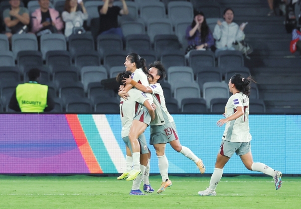 当地时间3月9日,在澳大利亚悉尼举办的2026年女足亚洲杯B组小组赛中,中国队2比1战胜朝鲜队。图为当日中国队球员陈巧珠(上)在比赛中与队友庆祝进球。