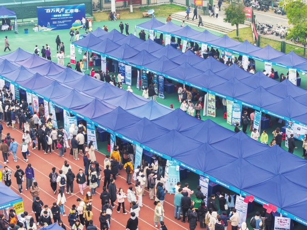 3月15日,学生在了解岗位信息。当天,中南大学举办2026届春季首场大型综合双选会暨湖南省高校毕业生综合类常设市场专场招聘会。本次双选会吸引775家企业参会,提供3.6万余个就业岗位,为毕业生搭建优质就业平台。