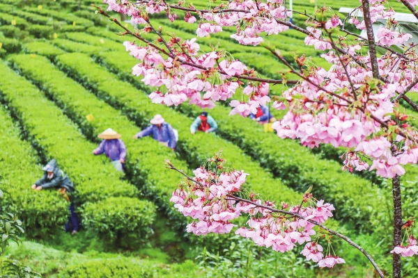 3月15日,龙山县红岩溪镇肖家坪村,茶农冒雨采摘首批春茶鲜叶。初春时节,茶农抢抓农时,采摘春茶供应市场,增加收入。