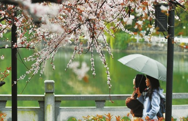 3月16日,长沙望月公园。近日,该公园铜盆湖畔的樱花渐次开放,尽管春雨绵绵,仍有不少游客冒雨前来赏花,感受别样春色。