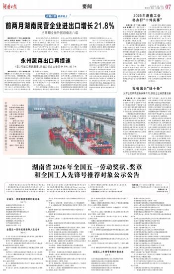 根据《中华全国总工会办公厅关于做好2026年全国五一劳动奖推荐评选工作的通知》精神,为体现公开、公平、公正原则,广泛听取群众意见,按照评选推荐程序,现将我省10个全国五一劳动奖状推荐对象、42名全国五一劳动奖章推荐人选和35个全国工人先锋号推荐对象名单予以公示(公示推荐对象简要事迹 见湖南工会网https://www.hnghw.com)。公示期间,如对推荐对象有异议的,可以信函、电话、传真等方式向我会反映。反映问题须实事求是,客观公正。为便于了解情况,请举报人签署或告知本人真实姓名、工作单位和联系方式等。