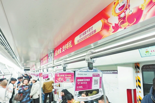 长沙地铁上的招商银行长沙分行消费返现券广告。(资料照片)通讯员 摄