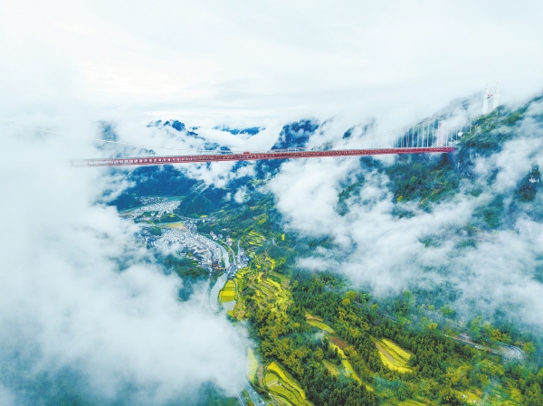 3月18日,吉首市矮寨奇观旅游区雨后初霁,云雾缭绕间,矮寨大桥若隐若现,宛如一幅水墨丹青画。