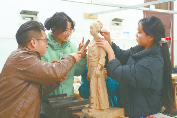 3月31日,通道侗族自治县职业技术总校,非遗代表性传承人在指导学生学习木雕技艺。近年来,该县深化民族地区职业教育改革,走出了一条“非遗传承+产教融合+服务县域”的特色发展之路。