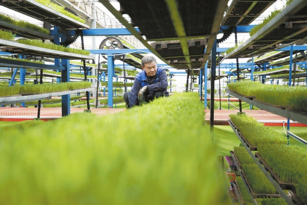 4月2日,长沙县春华镇智能化育秧工厂,工作人员在管护早稻秧苗。