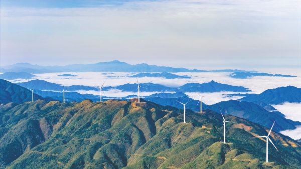 4月1日清晨,溆浦县紫荆山风电场,山巅耸立的风电机组与云海相映成景。