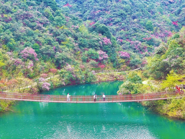 4月5日,双牌县阳明山国家森林公园万和湖景区山花绽放,吸引不少游客前来踏青赏花。